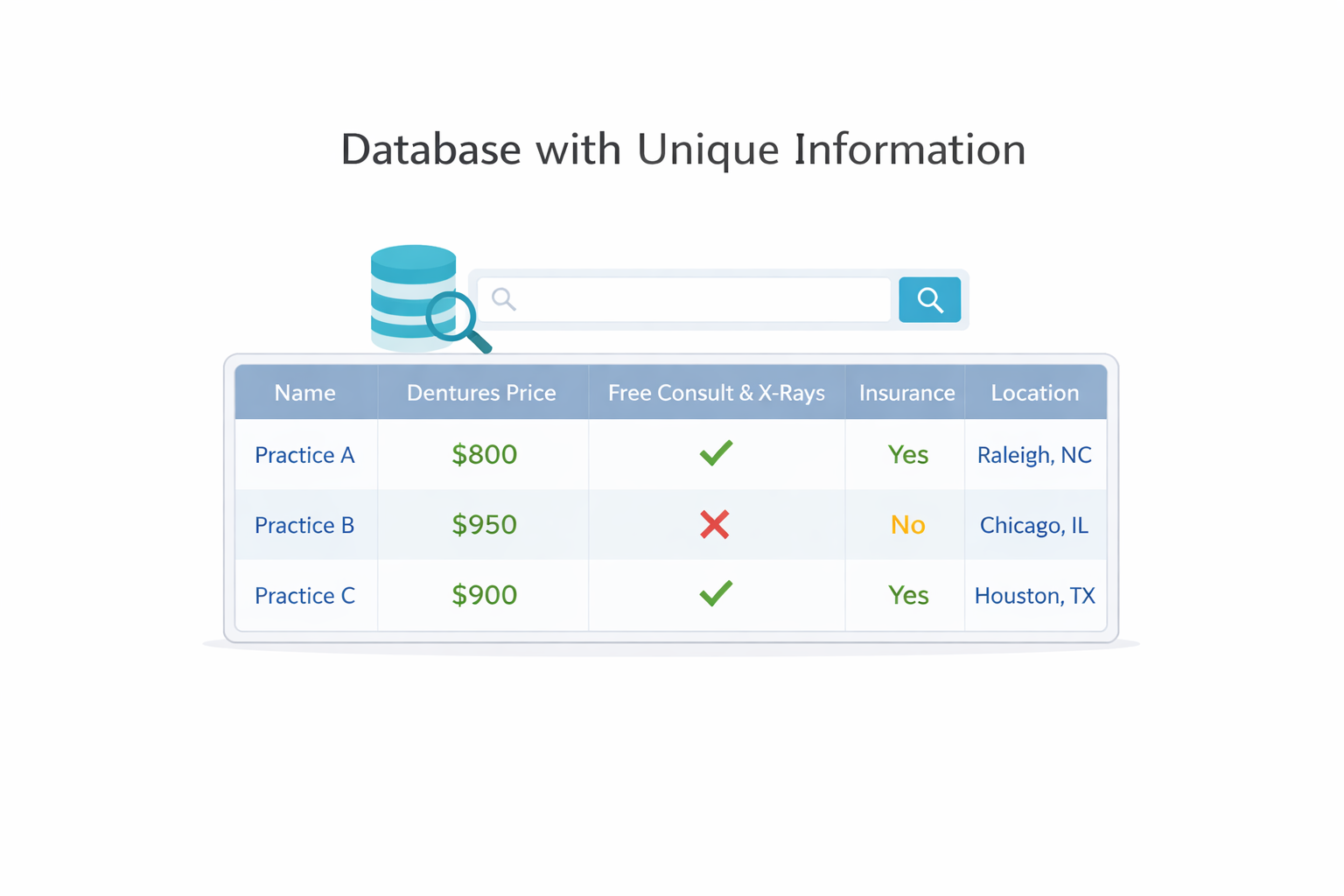 · This started with a database that had the unique information from each practice. It would then automatically pull this information into our search template when we put the practice number.